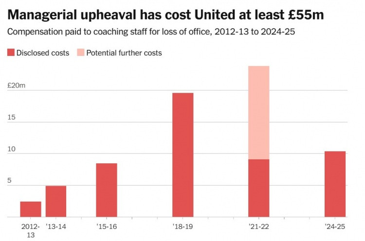 Kể từ khi Ferguson nghỉ hưu vào năm 2013, Manchester United đã trả một mức giá đáng kinh ngạc cho sự thay đổi thường xuyên của các huấn luyện viên. Dữ liệu cho thấy tổng số "phí chia tay" được trả bởi câu lạc bộ đã đạt 54,9 triệu bảng.