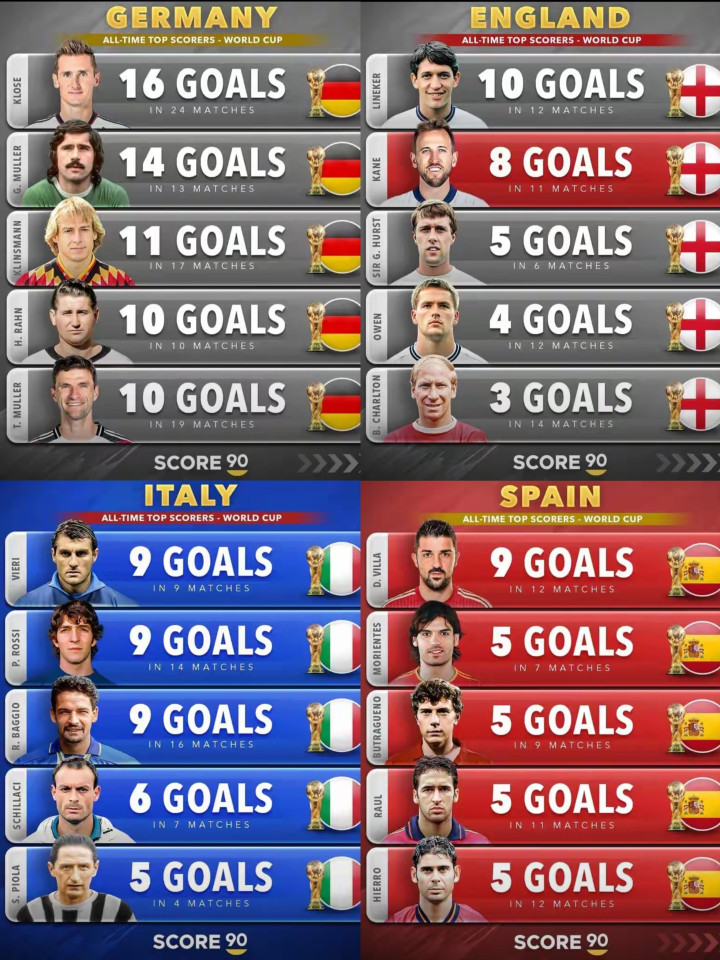 Đức, Anh, Ý và Tây Ban Nha đứng thứ hai trong lịch sử ghi bàn tại World Cup