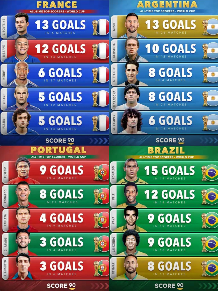 Pháp, Argentina, Bồ Đào Nha và Brazil là những quốc gia ghi nhiều bàn thắng nhất trong lịch sử World Cup và là những cỗ máy ghi bàn hiệu quả nhất. Khoảng cách là trong tầm tay. Trong danh sách vua phá lưới lịch sử World Cup, Mbappé đang vững vàng dẫn đầu với thành tích 12 bàn, chỉ kém 4 bàn so với thành tích 16 bàn của Klose. Điều đáng kinh ngạc hơn nữa là hiệu quả đáng kinh ngạc của anh - anh ghi 12 bàn sau 14 trận, trung bình 0,86 bàn mỗi trận. Klose, vua phá lưới hiện tại trong lịch sử World Cup, ghi 16 bàn sau 24 trận, trung bình 0,67 bàn/trận. Messi được hầu hết chuyên gia và người hâm mộ coi là vua bóng thế hệ thứ ba, mất 26 trận để ghi 13 bàn, trung bình chỉ 0,5 bàn/trận. Hiệu suất ghi bàn tại World Cup của Mpbapp có thể nói là áp đảo ở thời điểm hiện tại và khoảng cách 4 bàn đã nằm trong tầm tay. Ở World Cup 2022 ở Qatar, Mbappé ghi 8 bàn trong một buổi, trở thành một trong những cầu thủ ghi nhiều bàn nhất trong một buổi chỉ sau Fontaine. Sức mạnh bùng nổ trong thi đấu chính là niềm tin cốt lõi để lập kỷ lục. Tính đến thời điểm hiện tại của mùa giải này, Mbappé đã ghi 17 bàn sau 13 trận cho Real Madrid trên mọi đấu trường. Anh ấy cứ 67 phút lại tham gia vào một bàn thắng, chứng tỏ ý thức ghi bàn, khả năng nắm bắt cơ hội và phong độ ổn định là vô song ở La Liga.