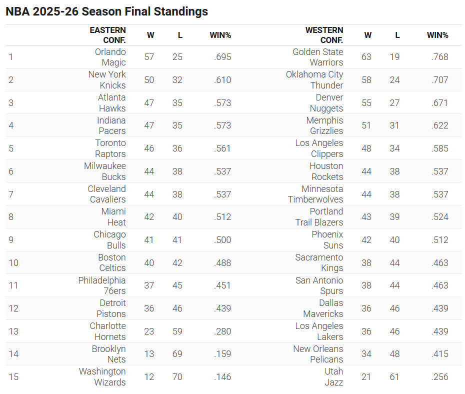 Bài báo viết rằng kết quả sau cuộc chiến cuối năm: Magic đứng đầu miền Đông (18 thắng và 8 thua), còn Warriors đứng đầu miền Tây (20 thắng và 7 thua). Trước trận đấu All-Star (15/2): Warriors trở thành tâm điểm của giải đấu, dẫn đầu giải đấu với 42 trận thắng và 13 trận thua, còn Eastern Conference được dẫn dắt bởi Magic trẻ tuổi. Kết thúc mùa giải thường vào tháng 4: Warriors và Thunder tranh nhau vị trí đầu bảng tại Western Conference. Warriors đảm bảo vị trí đầu bảng với chuỗi 10 trận toàn thắng ở giai đoạn cuối. Timberwolves đang mắc kẹt trong khu vực play-off, còn Mavericks vẫn đang cố gắng cạnh tranh vị trí thứ 10. Celtics đang có tỷ số 19-30 kể từ khi vô địch NBA Cup, giữ suất dự vòng loại trực tiếp với tỷ số cách biệt. Trong số đó, Lakers xếp thứ 13 tại Western Conference với 36 trận thắng và 46 trận thua và bỏ lỡ vòng play-off. Nets và Wizards đứng cuối với lần lượt 13 trận thắng và 12 trận thắng.